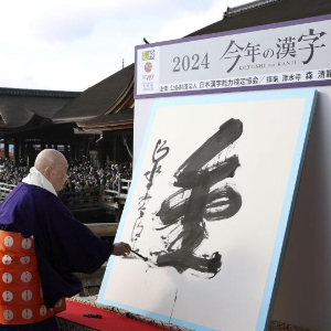 12月12日,在日本京都,清水寺住持森清范用毛笔书写日本2024年度汉字“金”字。