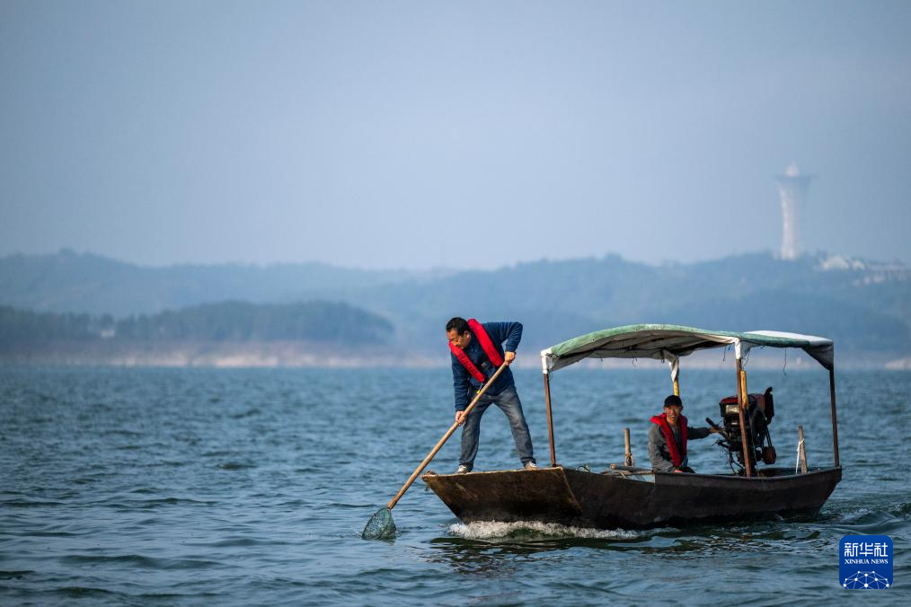 丹江口市清漂队队员在丹江口水库进行清漂作业(10月28日摄)。