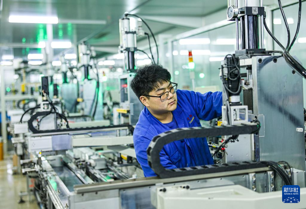 12月12日,在山东省荣成市一家燃气计量仪表制造企业的智能化生产车间内,维修工人在进行设备调试。