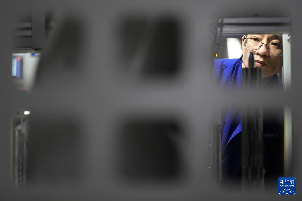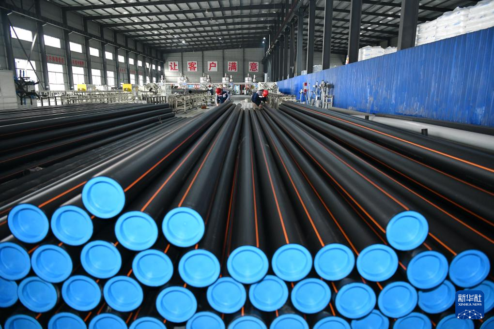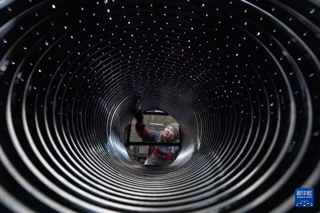 12月12日,质检员在河北省沧州市孟村回族自治县一家管道装备企业生产车间检测燃气管材。