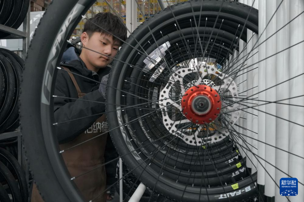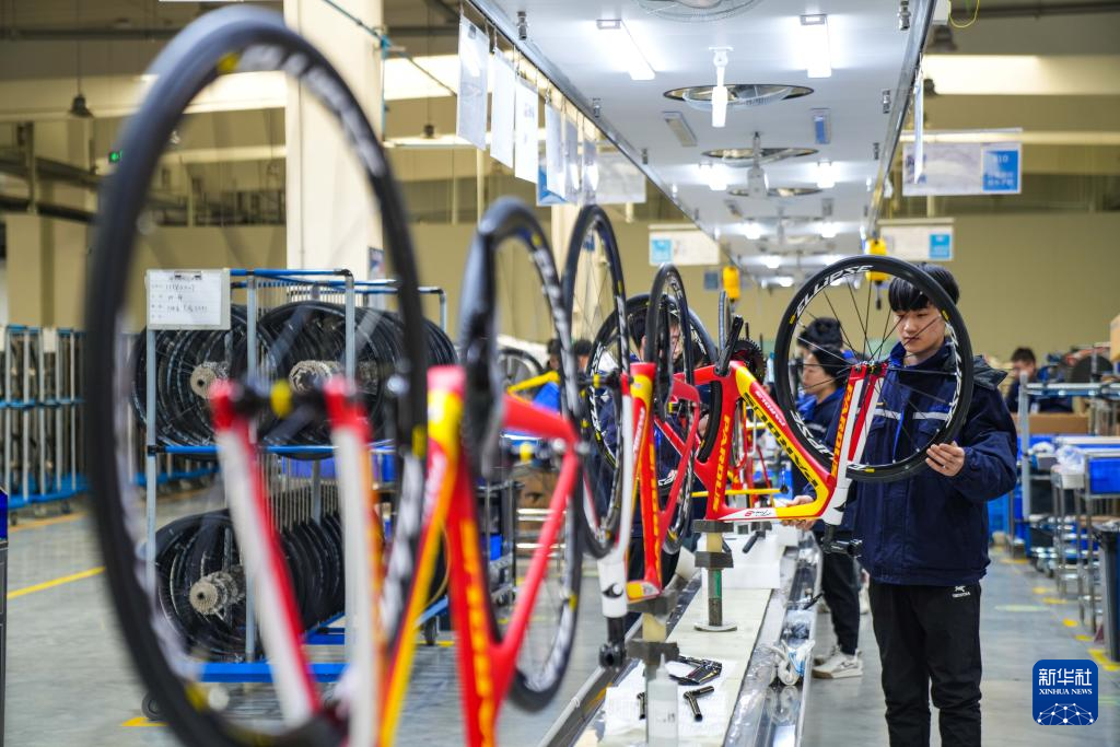 12月12日,山东省乐陵市经济开发区一体育用品生产企业,工人在碳纤维自行车生产线上赶制一批出口海外的订单。