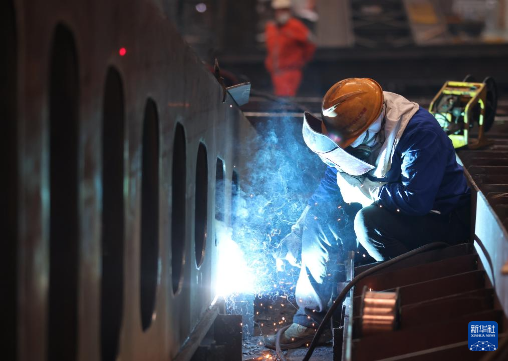 12月12日,湖北省中铁科工轨道公司技术人员对船厂设备进行电焊作业。