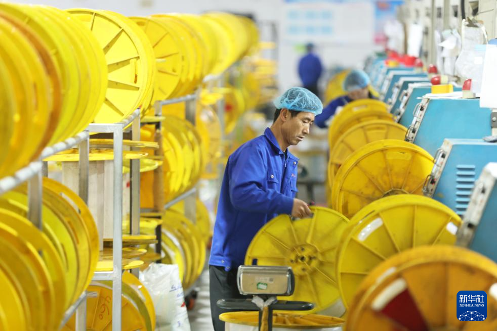 12月12日,工人在江苏省兴化市戴南镇的江苏银锡高温线缆有限公司生产车间作业。