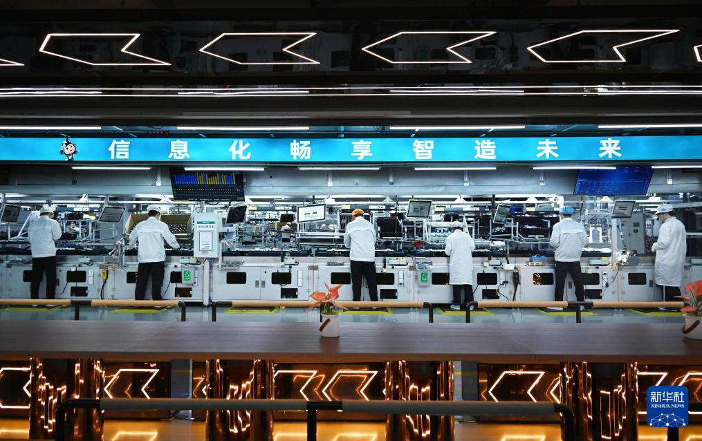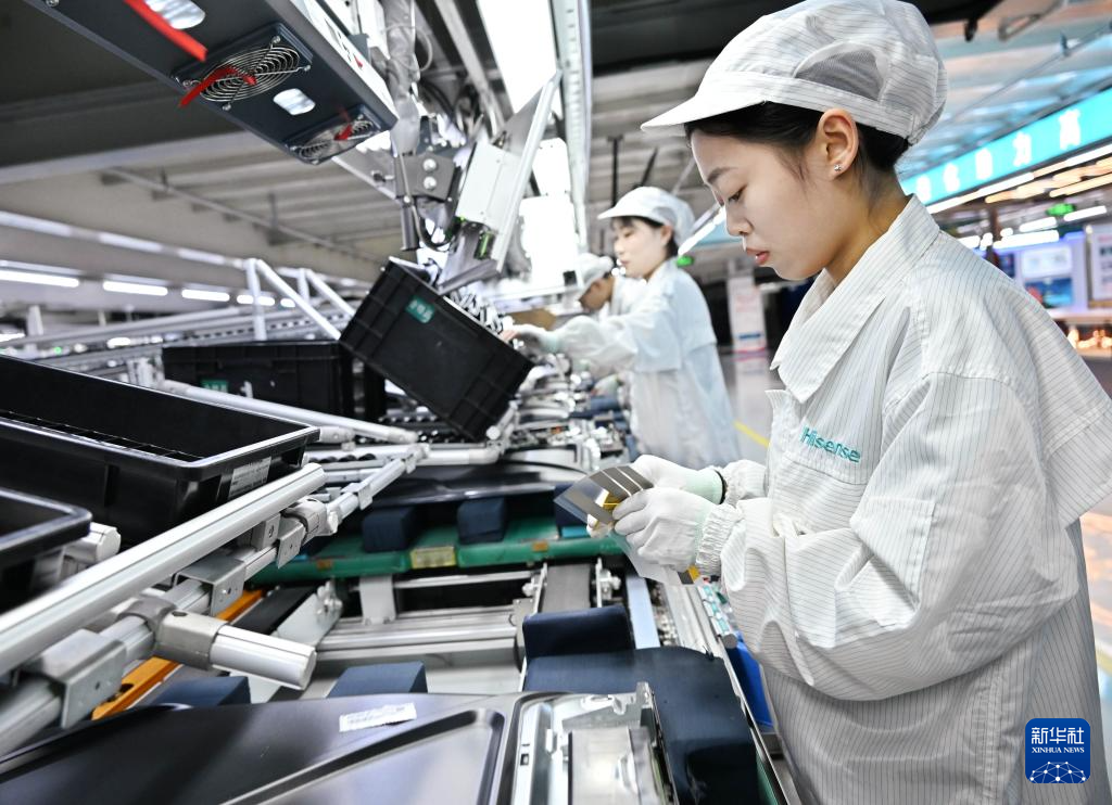 12月10日,海信视像科技黄岛工厂员工在生产线上组装电视机。