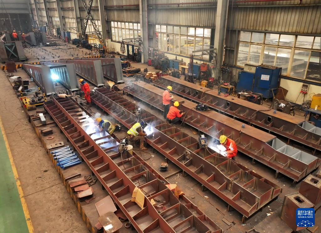 12月12日,在位于浙江省湖州市德清县雷甸镇的浙江省建设工程机械集团有限公司德清精益智能工厂,工人在赶制履带式轻型组塔装置产品。