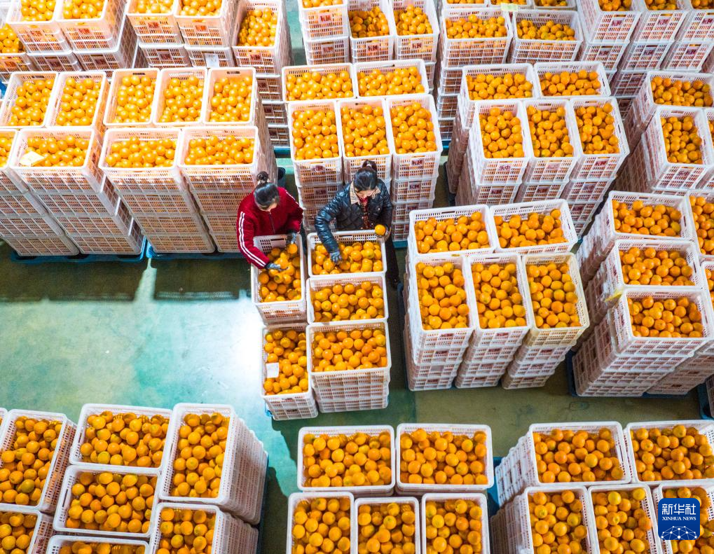 12月12日,工人在湖北省秭归县辰颐物语华中秭归电商物流产业园鲜橙包装车间忙碌(无人机照片)。