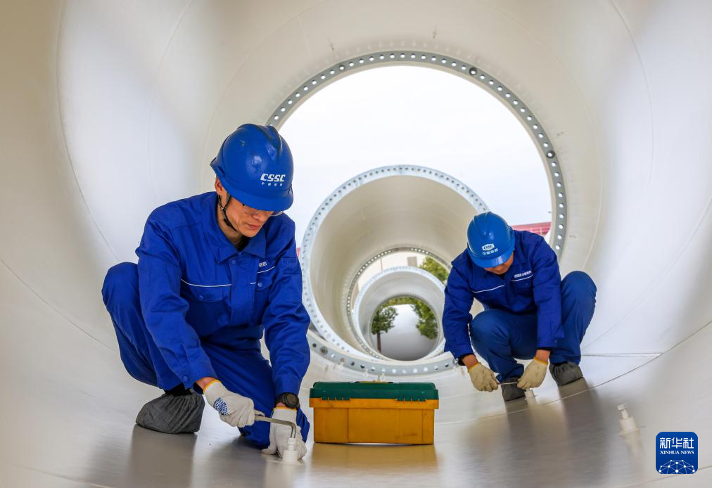 12月12日,在江苏省扬州市江都区中船澄西扬州船舶有限公司,工人在风力发电机塔筒内工作。