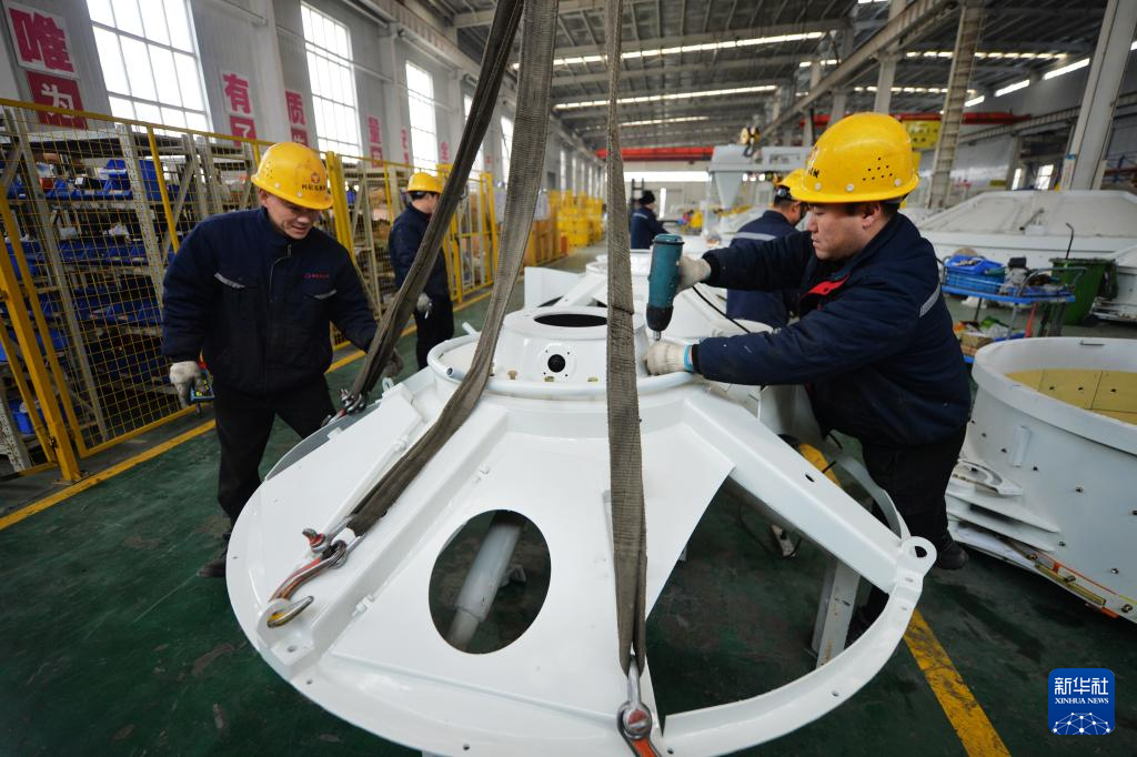 12月12日,在山东省青岛市城阳区夏庄街道青岛中青林集团有限公司生产车间内,工人在吊装混凝土设备部件。