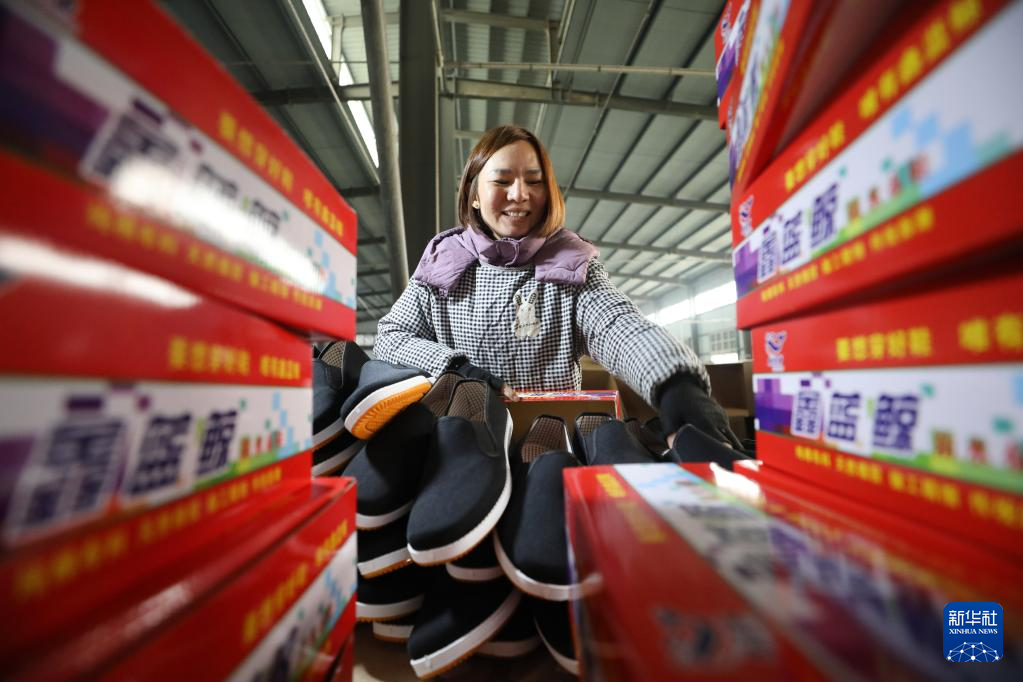 12月12日,河南省焦作市温县张羌街道一家制鞋企业的工人在包装鞋。