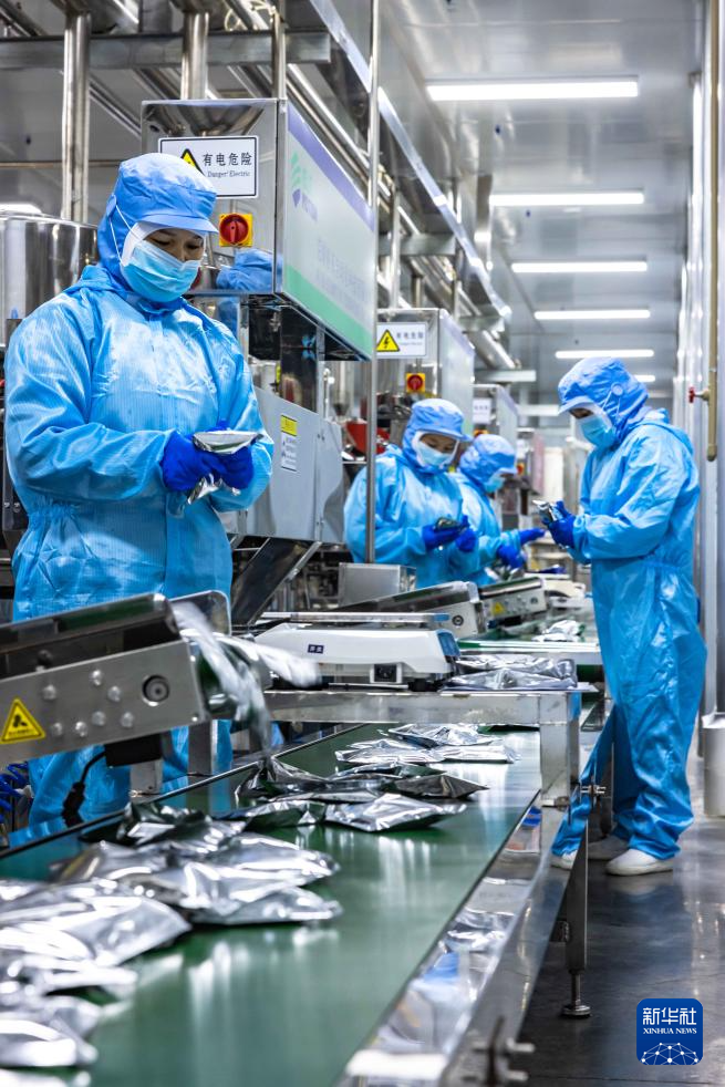 12月12日,工作人员在贵州省安顺市西秀区南山婆食品生态产业园对成品酸汤粉进行包装。