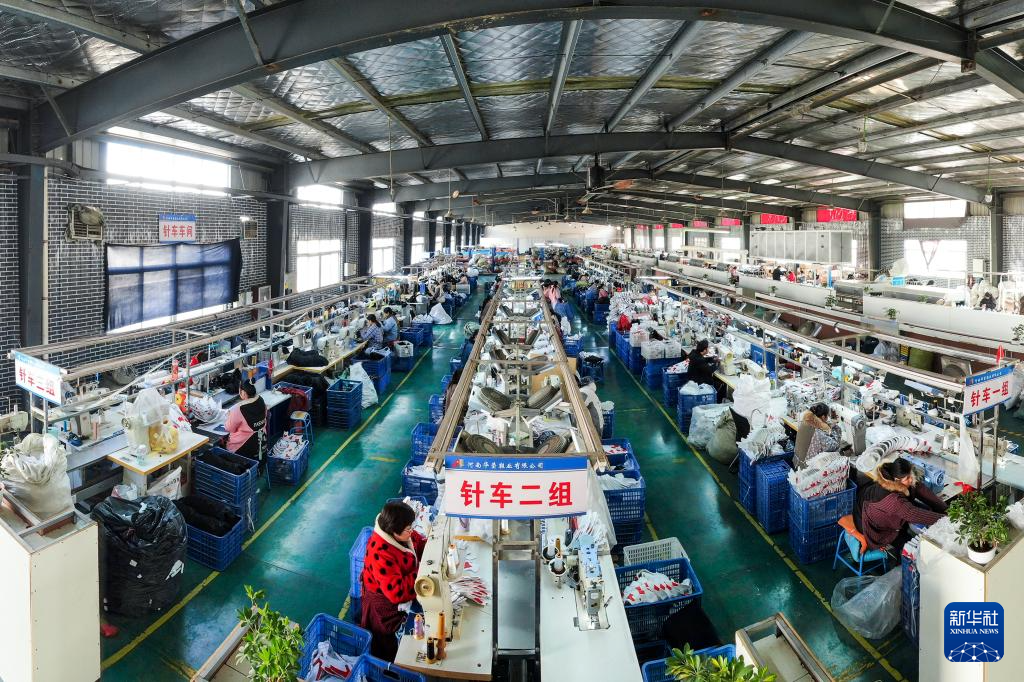 12月11日,在河南省商丘市睢县高新技术产业开发区的河南华莹鞋业有限公司生产车间内,工人们赶制运动鞋外贸订单(无人机照片)。