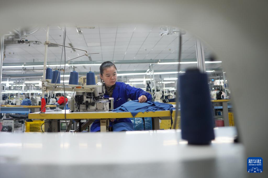 12月12日,在河北省邢台市内丘县一家制衣企业,工人在车间加工服装。