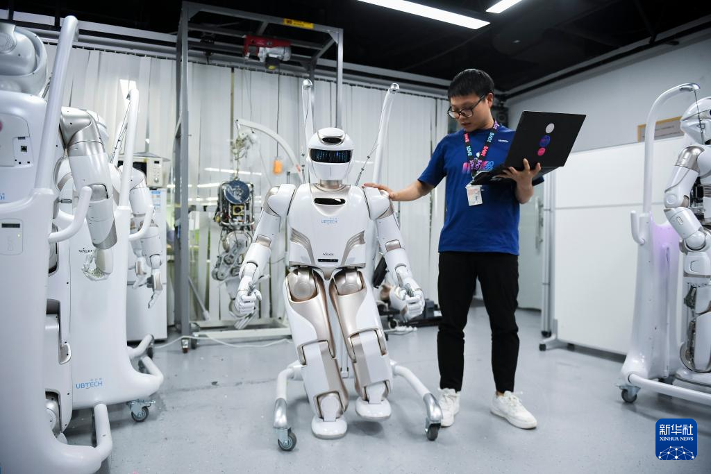 6月26日,在深圳市优必选科技股份有限公司总部,工作人员对人形机器人Walker X进行测试。