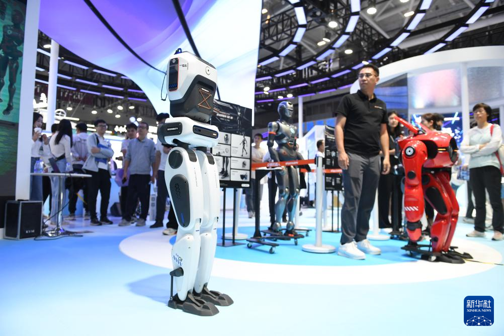 11月14日,在深圳举行的第二十六届中国国际高新技术成果交易会上,深圳市众擎机器人科技有限公司展示双足机器人SA01的行走能力。