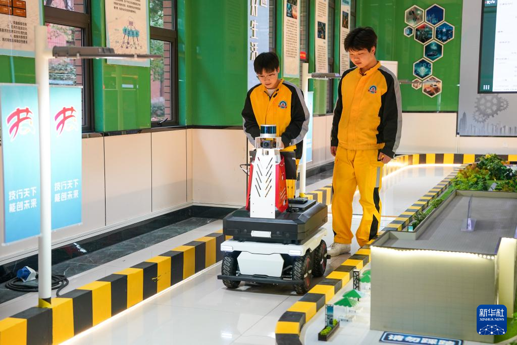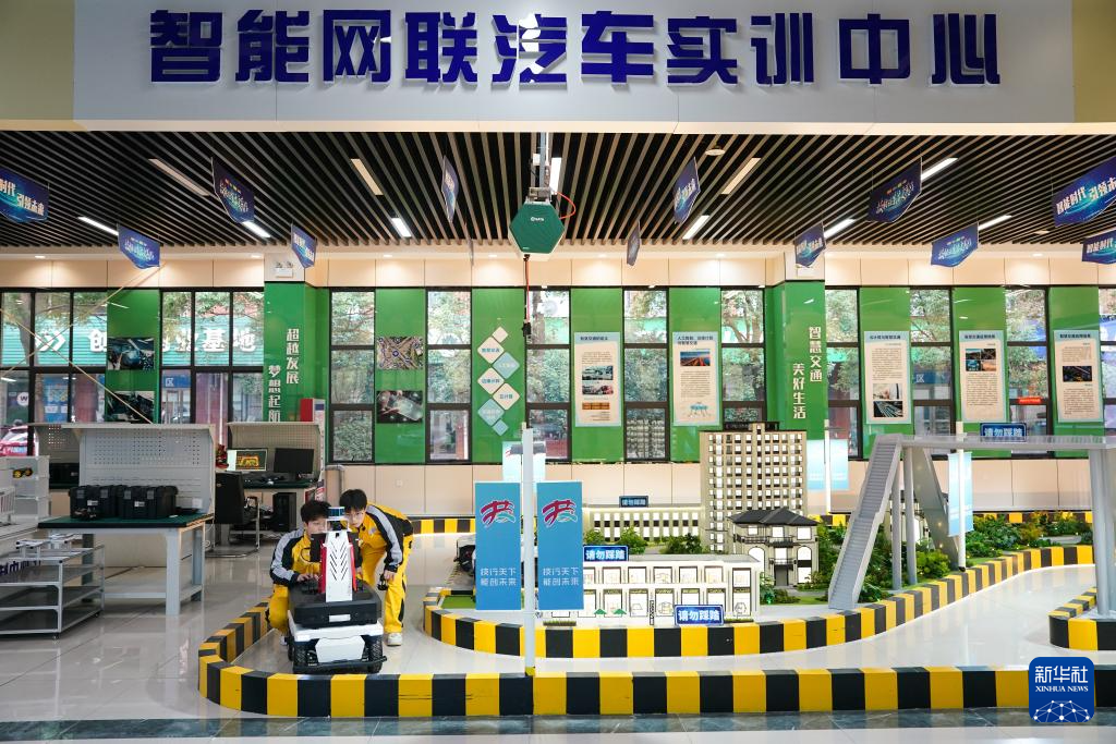 12月10日,在安徽万通技师学院车联网与智能交通展示中心,郑飘雪(右)、王文韬调试自动驾驶车辆。