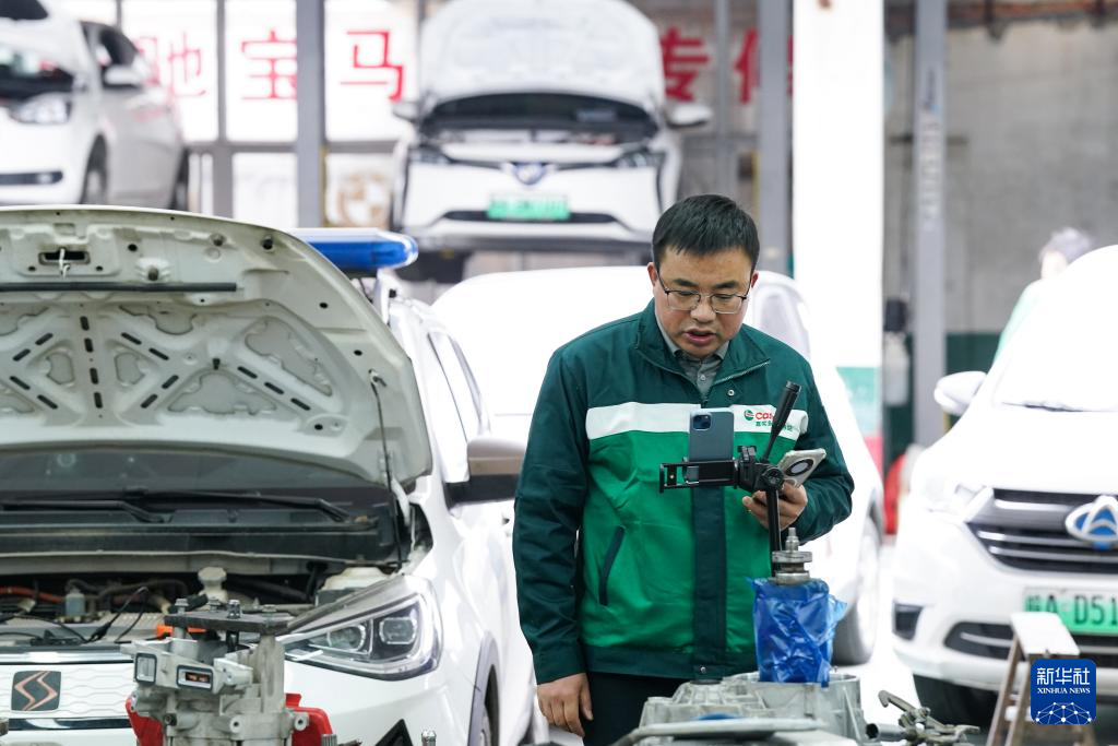 12月9日,赵飞在合肥荣创汽车服务有限公司修理新能源汽车。