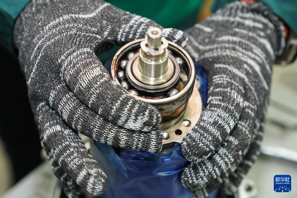 12月9日,赵飞在合肥荣创汽车服务有限公司修理新能源汽车变速器上的轴承。