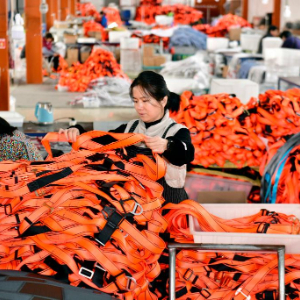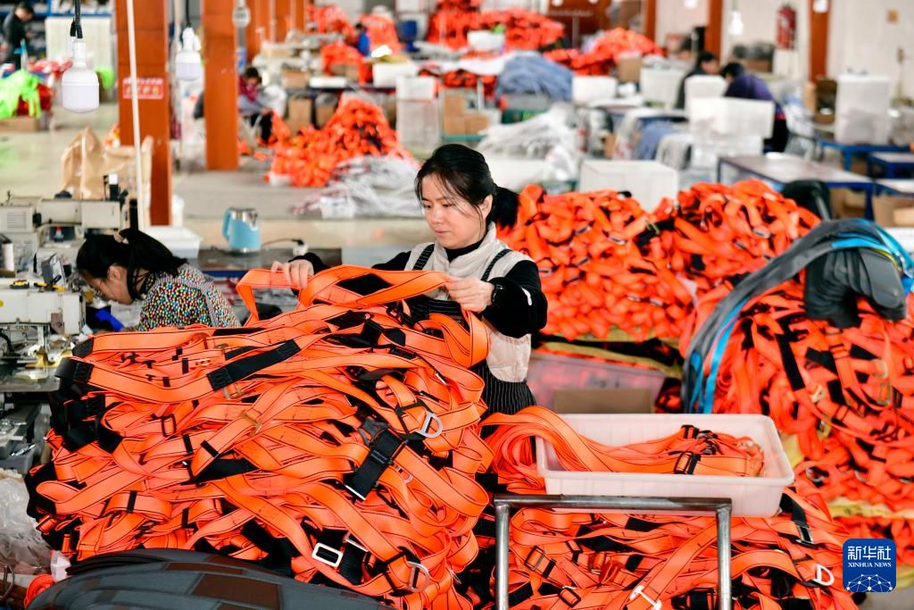 12月13日,在惠民县姜楼镇一处惠民工坊,工作人员在整理安全带。