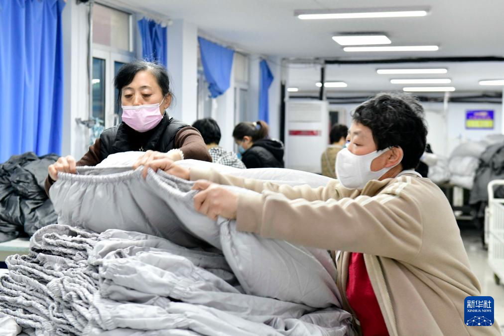 12月13日,在惠民县胡集镇一处惠民工坊,工作人员在整理家纺产品。