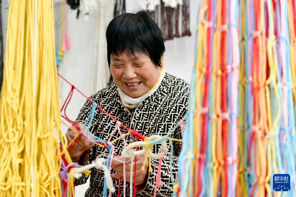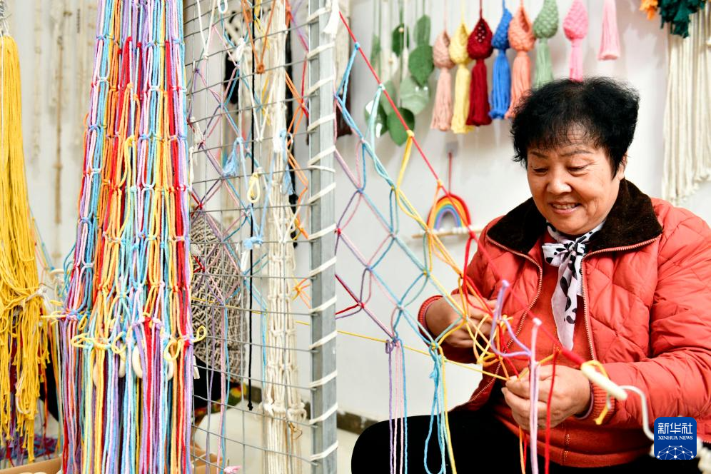 12月13日,在惠民县姜楼镇一处巾帼共富工坊,工作人员在编织绳网。