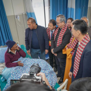 12月14日,在尼泊尔加德满都谷地城市巴克塔普尔参加活动启动仪式的嘉宾探望一名已接受白内障手术的患者。