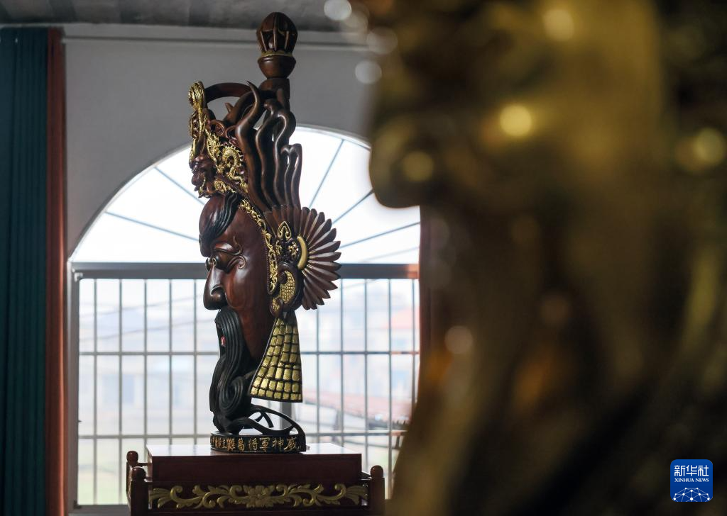 这是彭国龙雕刻的傩面具作品(12月13日摄)。