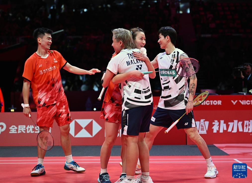 12月15日,郑思维(左一)/黄雅琼(右二)获胜后与陈堂杰(右一)/杜颐沩拥抱致意。