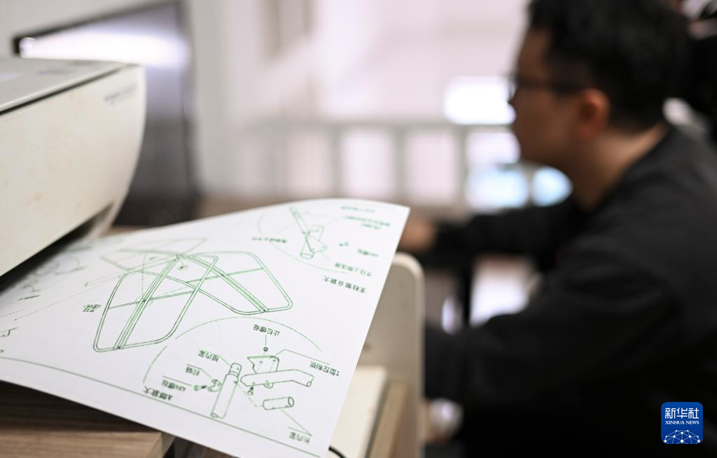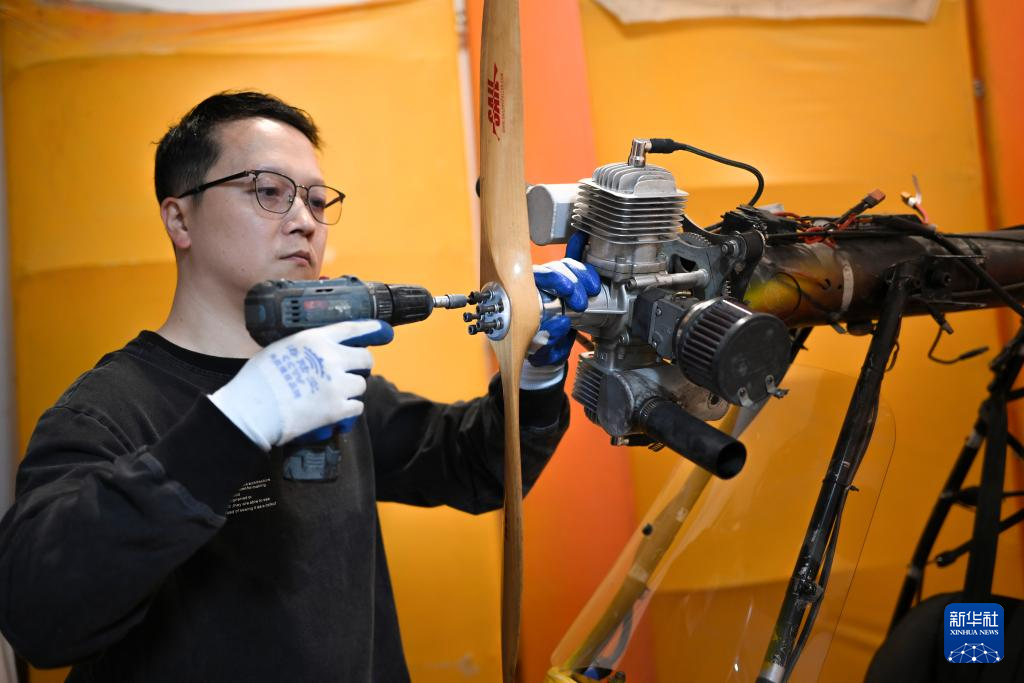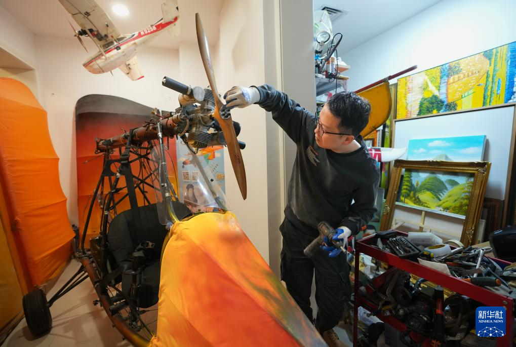 12月13日,在位于深圳市龙岗区大芬油画村的工作室,陈剑华在调试自己制造的飞机。新华社记者 江宏景 摄