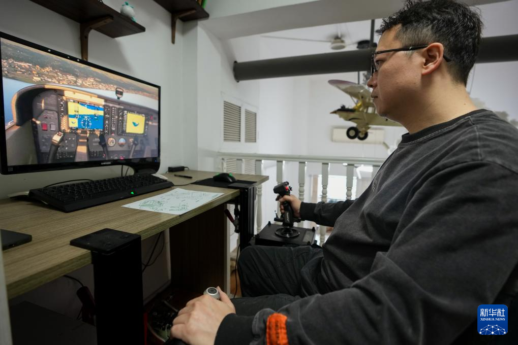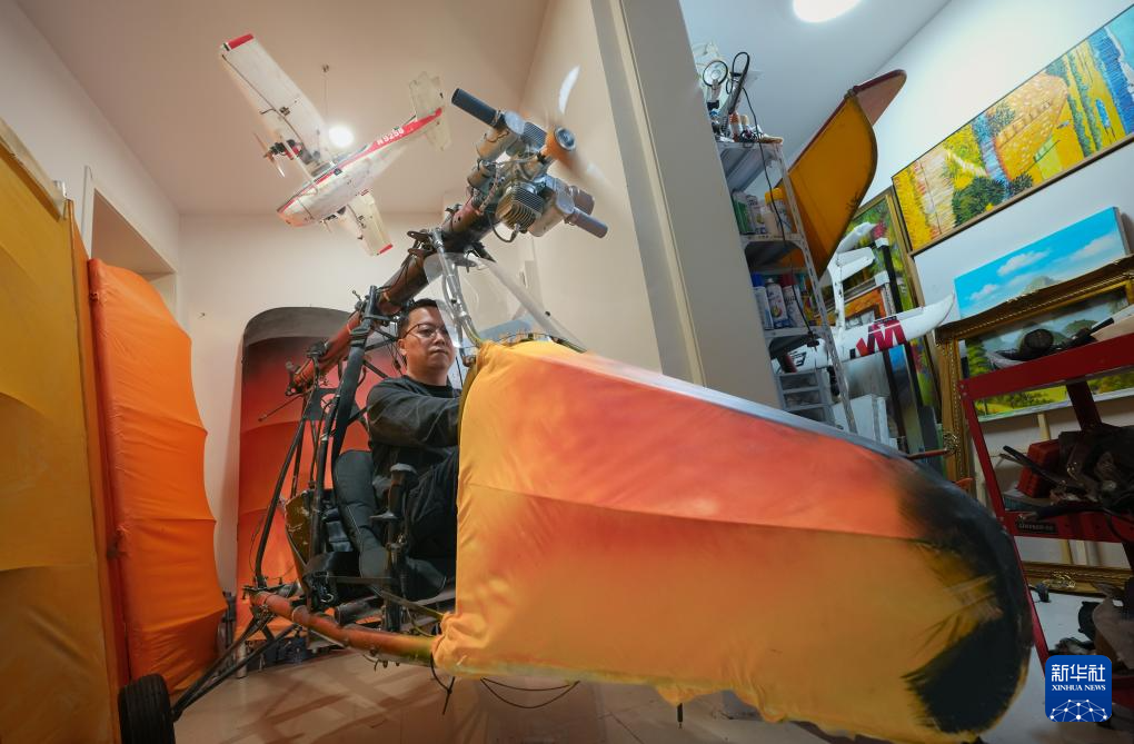 12月13日,陈剑华在位于深圳市龙岗区大芬油画村的工作室里模拟飞行。新华社记者 江宏景 摄