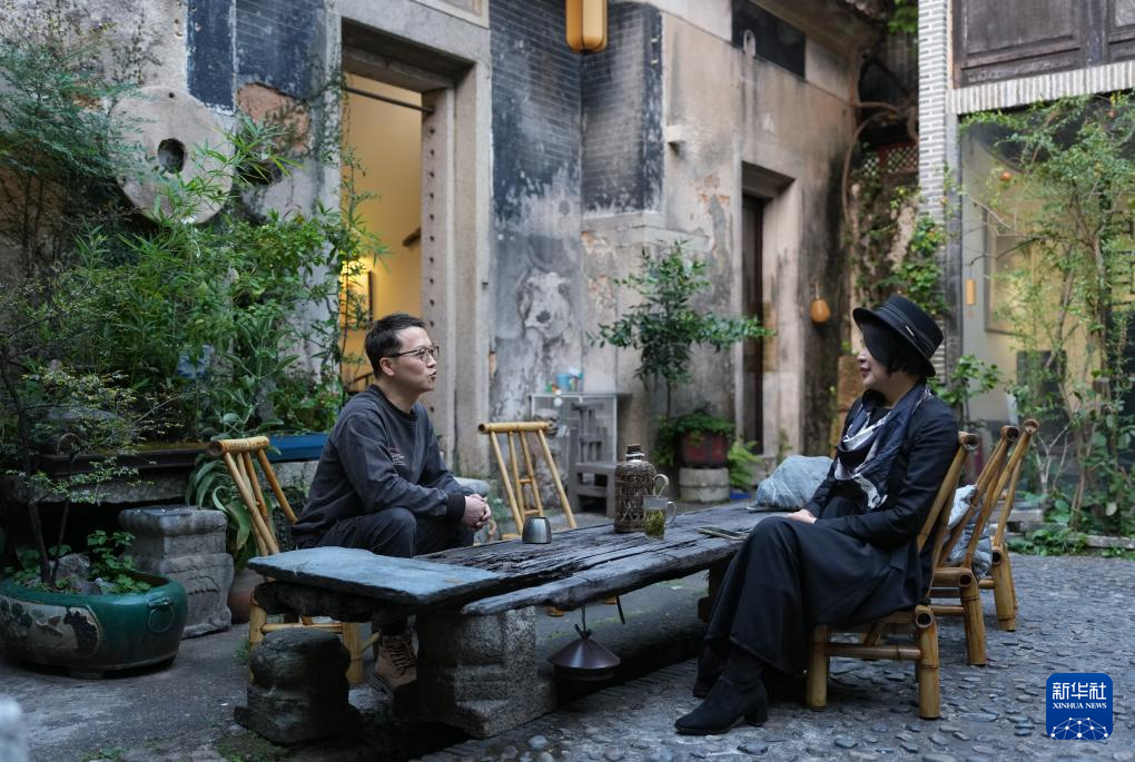12月13日,在深圳市龙岗区大芬油画村太阳山艺术中心,陈剑华(左)与同行交流。新华社记者 江宏景 摄