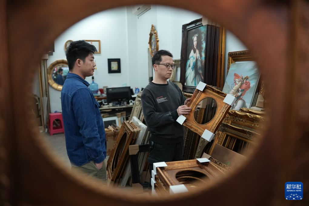 12月13日,陈剑华在深圳市龙岗区大芬油画村一家装裱相框店铺里选画框。新华社记者 江宏景 摄