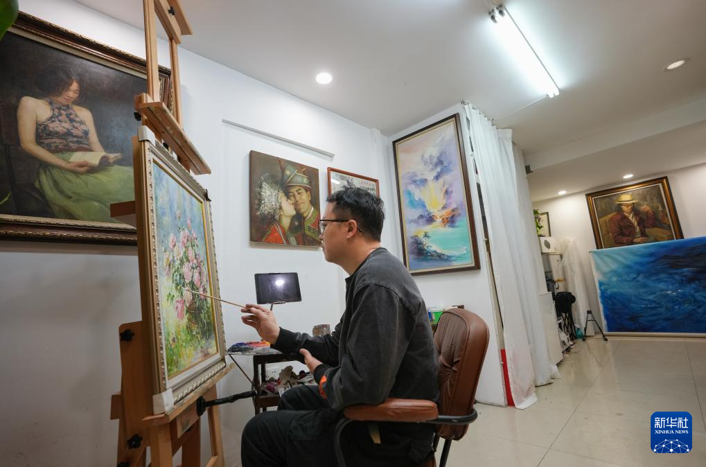 12月13日,在位于深圳市龙岗区大芬油画村的工作室里,陈剑华在画画。新华社记者 江宏景 摄