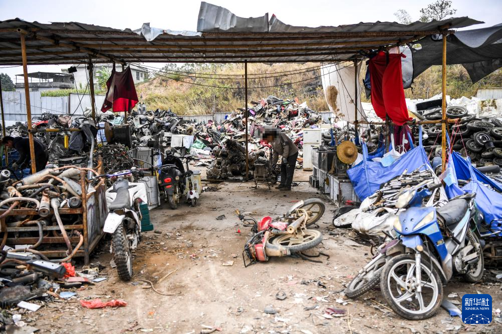 在广西柳州市一个废旧物品回收点,工人将回收来的废旧车辆就地拆解(12月13日摄)。在这个回收点,大量废旧冰箱、洗衣机、摩托车等被露天堆放在地上。