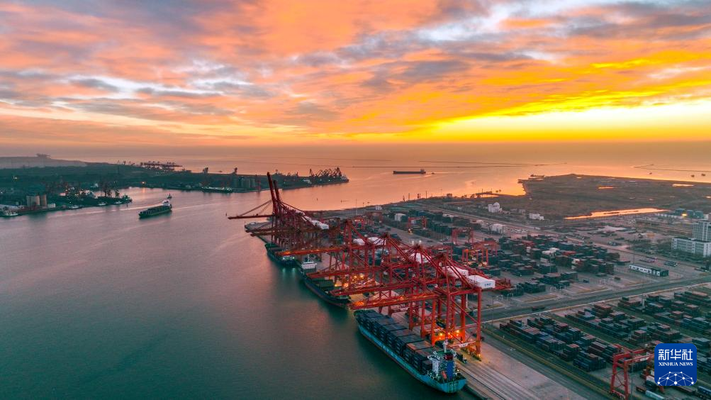 12月16日拍摄的河北省唐山港京唐港区繁忙的集装箱码头(无人机照片)。