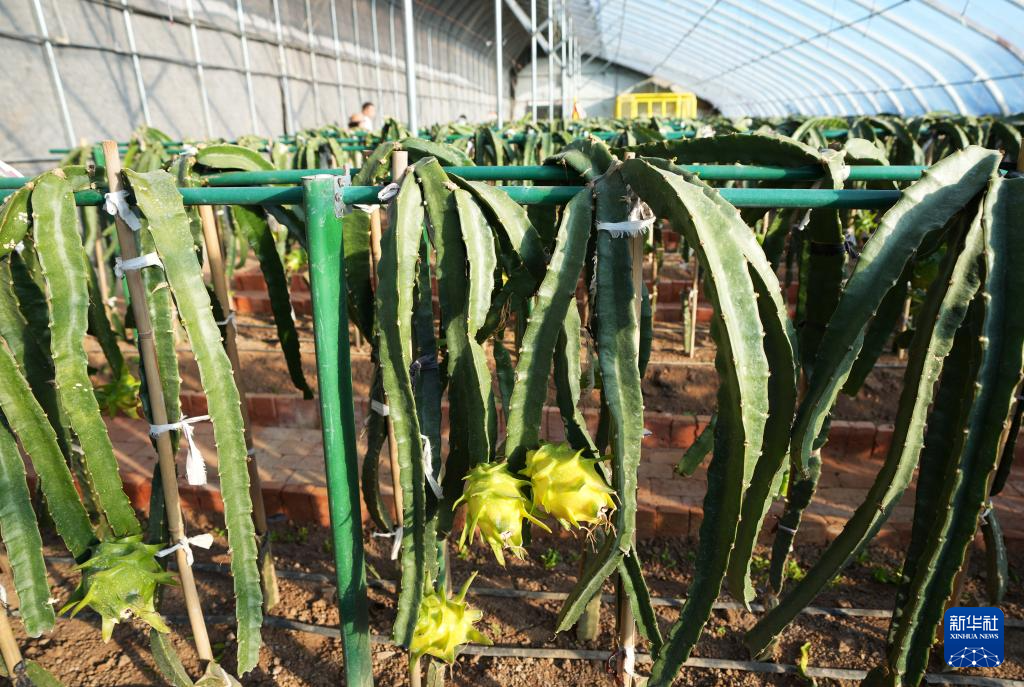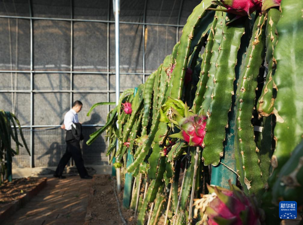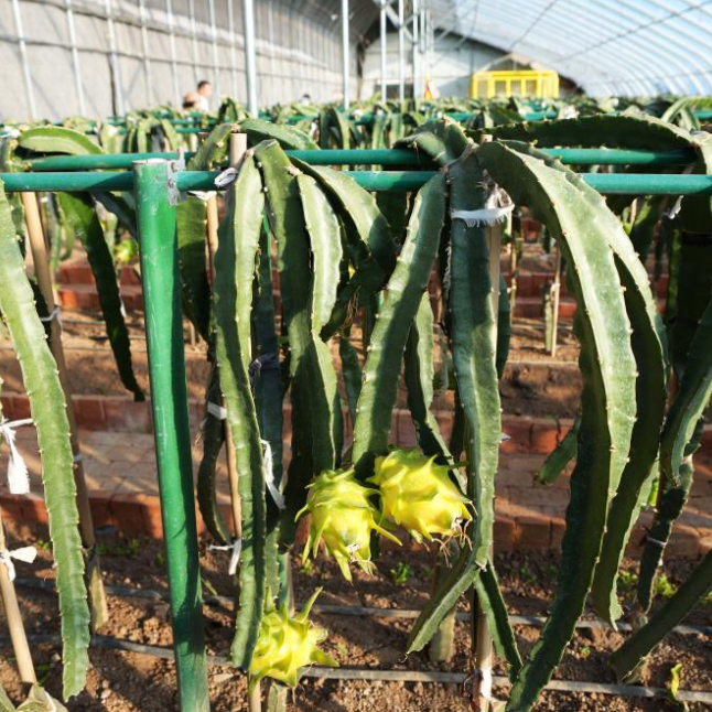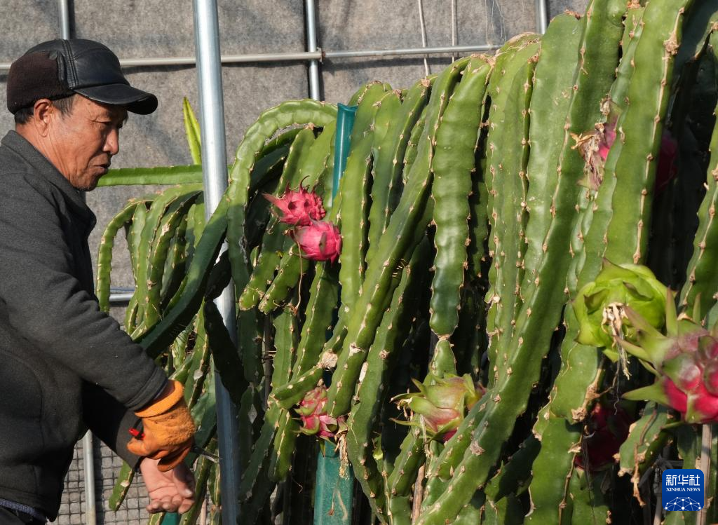 12月17日,在南营子村生态采摘园,当地农民忙着给火龙果整枝、修剪侧芽。