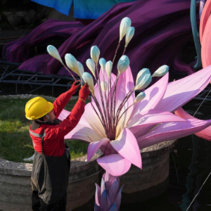 12月17日,施工人员在上海九曲桥边布置用于上海豫园灯会的灯组。