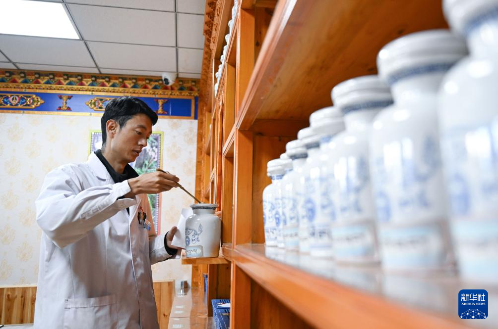 12月17日,在青海省海南藏族自治州共和县倒淌河镇中心卫生院,医生索南多杰在配制藏药。