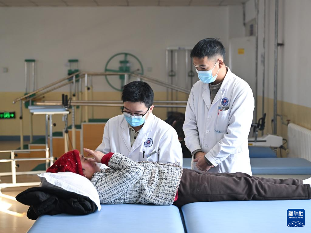 12月17日,在青海省海南藏族自治州共和县中医院,康复师李朝喆(上左)为患者治疗。