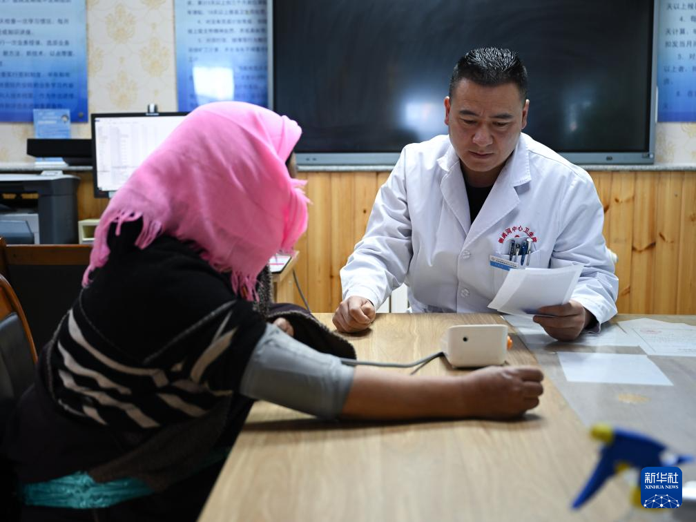 12月17日,在青海省海南藏族自治州共和县倒淌河镇中心卫生院,医生马建国在为患者量血压。