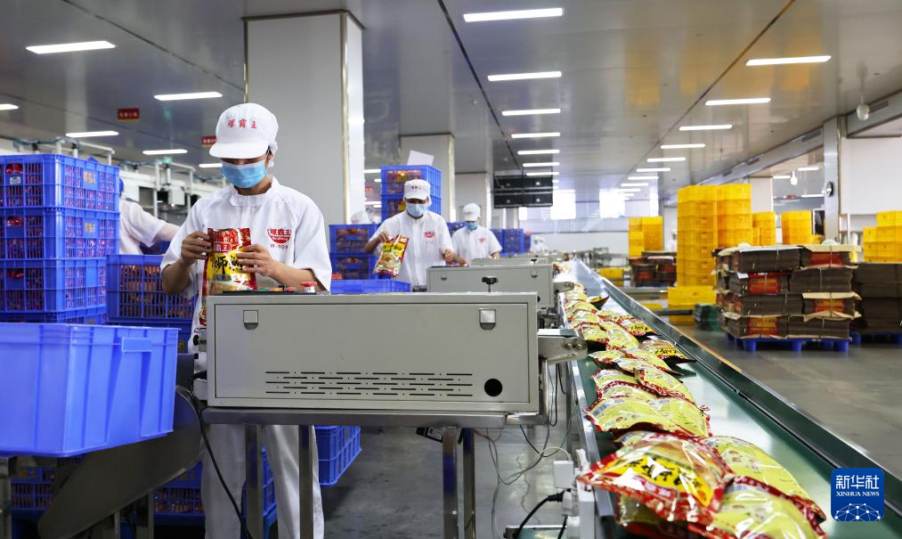 柳州市螺蛳粉产业园的一家螺蛳粉生产企业工作人员在生产线上作业(11月13日摄)。
