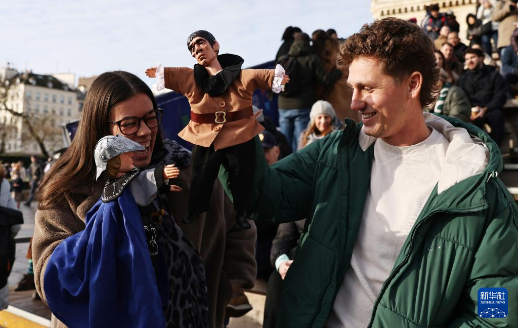 12月15日,在法国巴黎圣母院前,游客体验布袋木偶。