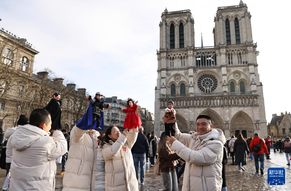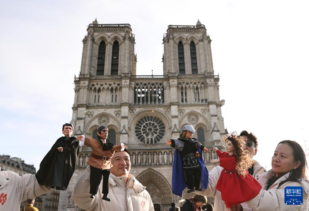 12月15日,在法国巴黎圣母院前,一名游客体验布袋木偶。