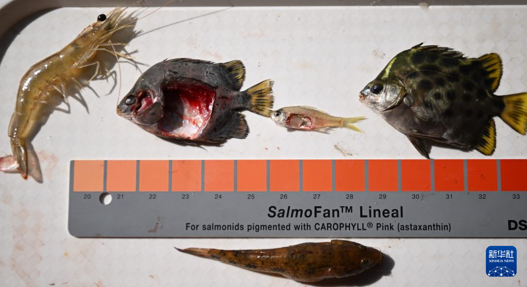 12月18日,在广东台山镇海湾红树林国家湿地公园的红树林种植-生态养殖耦合示范项目区,工作人员展示采集到的鱼虾样本。