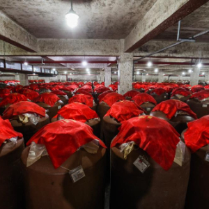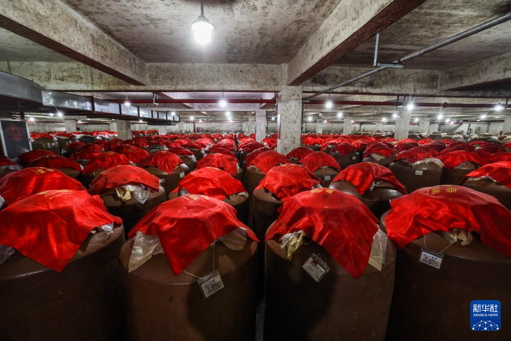 12月19日,在位于同山镇的浙江原锅酒业有限公司地下酒窖,整齐码放着装满同山烧的酒坛。