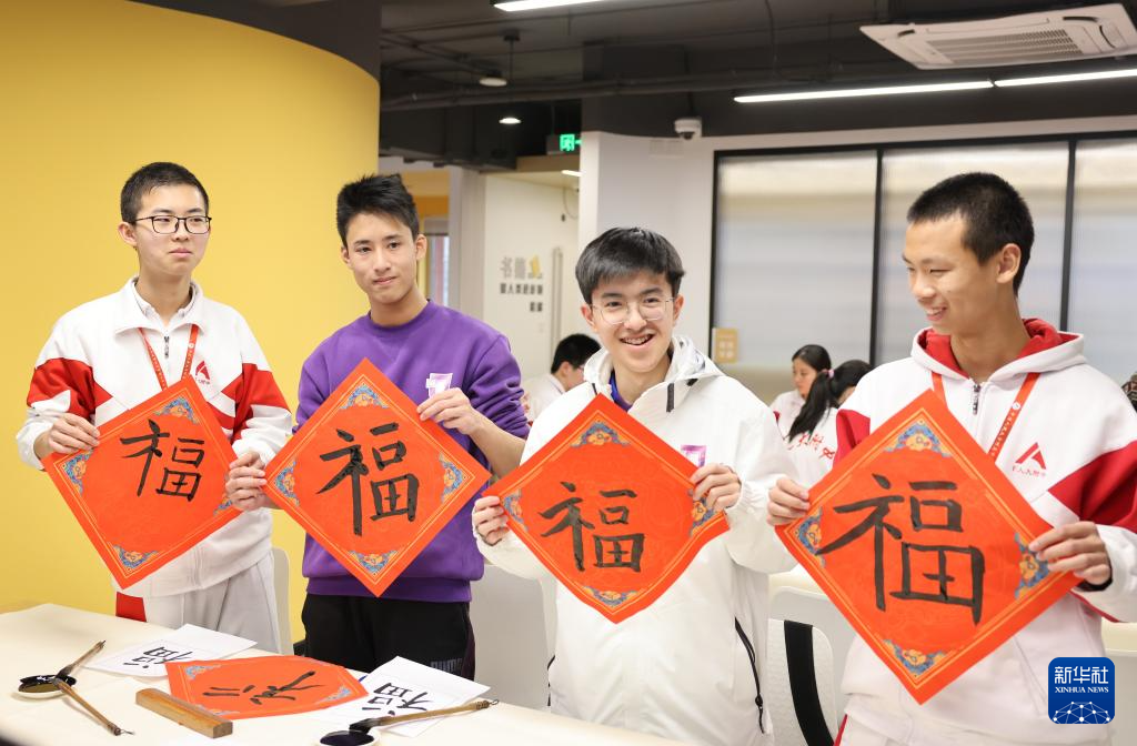 12月19日,香港第二届“国家安全教育参访团”的学生和人大附中分校的学生一起展示刚写好的“福”字。