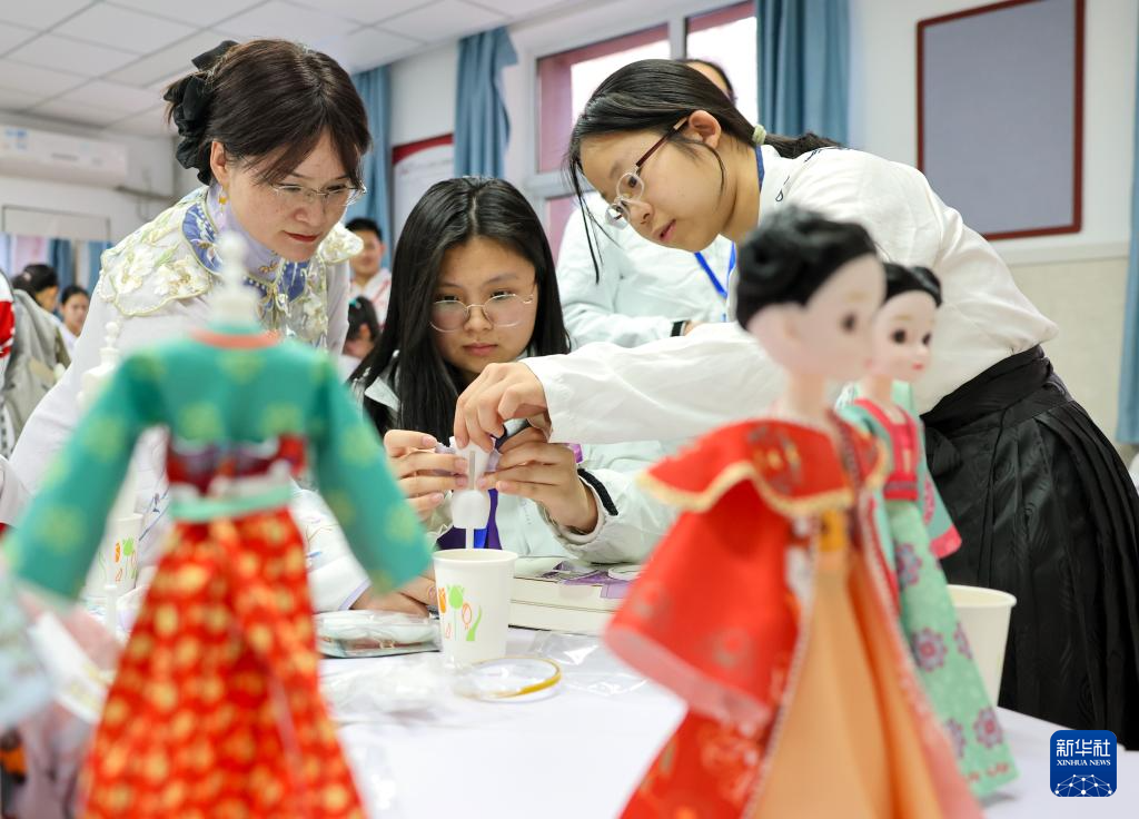 12月19日,在历史课上,香港第二届“国家安全教育参访团”的学生(中)在为人偶制作传统服饰。