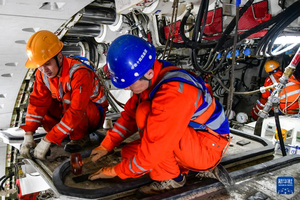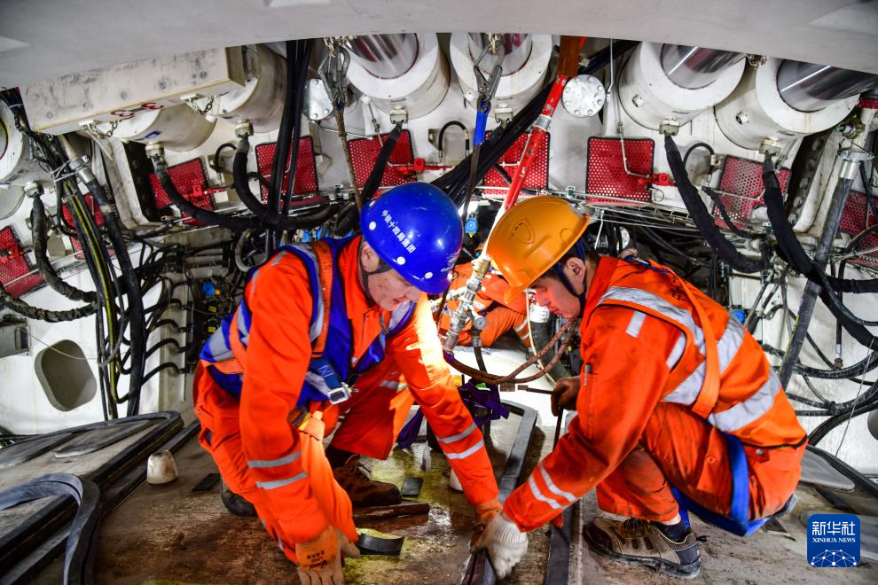 12月20日,中铁十四局建设者在黄岗路穿黄隧道内维护“山河号”盾构机。