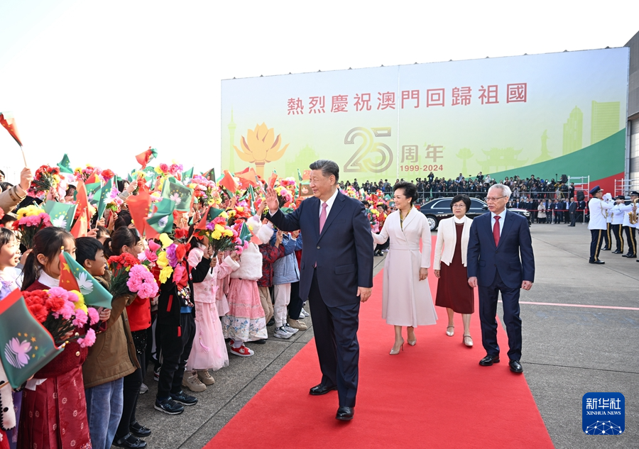 12月20日下午,中共中央总书记、国家主席、中央军委主席习近平圆满结束在澳门的各项活动,乘专机离开澳门。这是习近平和夫人彭丽媛向欢送人群挥手致意。