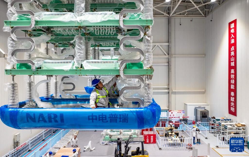 12月19日,在“疆电入渝”特高压渝北±800千伏换流站工程施工现场,安徽送变电工程有限公司的技术人员在进行国产换流阀的安装作业。