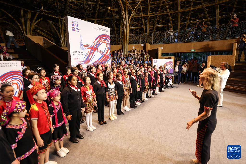 10月27日,在中国海南省五指山市毛纳村,巴黎宝丽声童声合唱团与五指山黎苗童声合唱团同台演出。